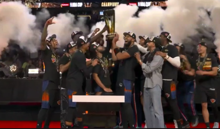 第三节尼克斯一度落后两位数,但他们顽强抵抗,三节打完尼克斯89-94落后5分,布伦森、唐斯等球员集体带队保持悬念;末节尼克斯一波15-2反超比分,之后一直压制马刺,最终124-113击败马刺,尼克斯夺得杯赛冠军,全队激情庆祝。