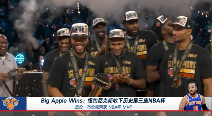 本场比赛,阿努诺比28分9篮板3助攻,布伦森25分4篮板8助攻,唐斯则是拿到16分11篮板;在颁奖仪式上,尼克斯众将戴上金牌,之后布伦森和唐斯一起举起冠军奖杯,最终布伦森荣获杯赛MVP,全队为他欢呼庆祝。