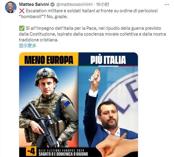 萨尔维尼还说,欧洲人必须停止讨论欧洲重整军备、共同举债购买导弹“以及其他马克龙式主张”,要相信特朗普的调解。反正,“我们的孩子不会去乌克兰作战。”